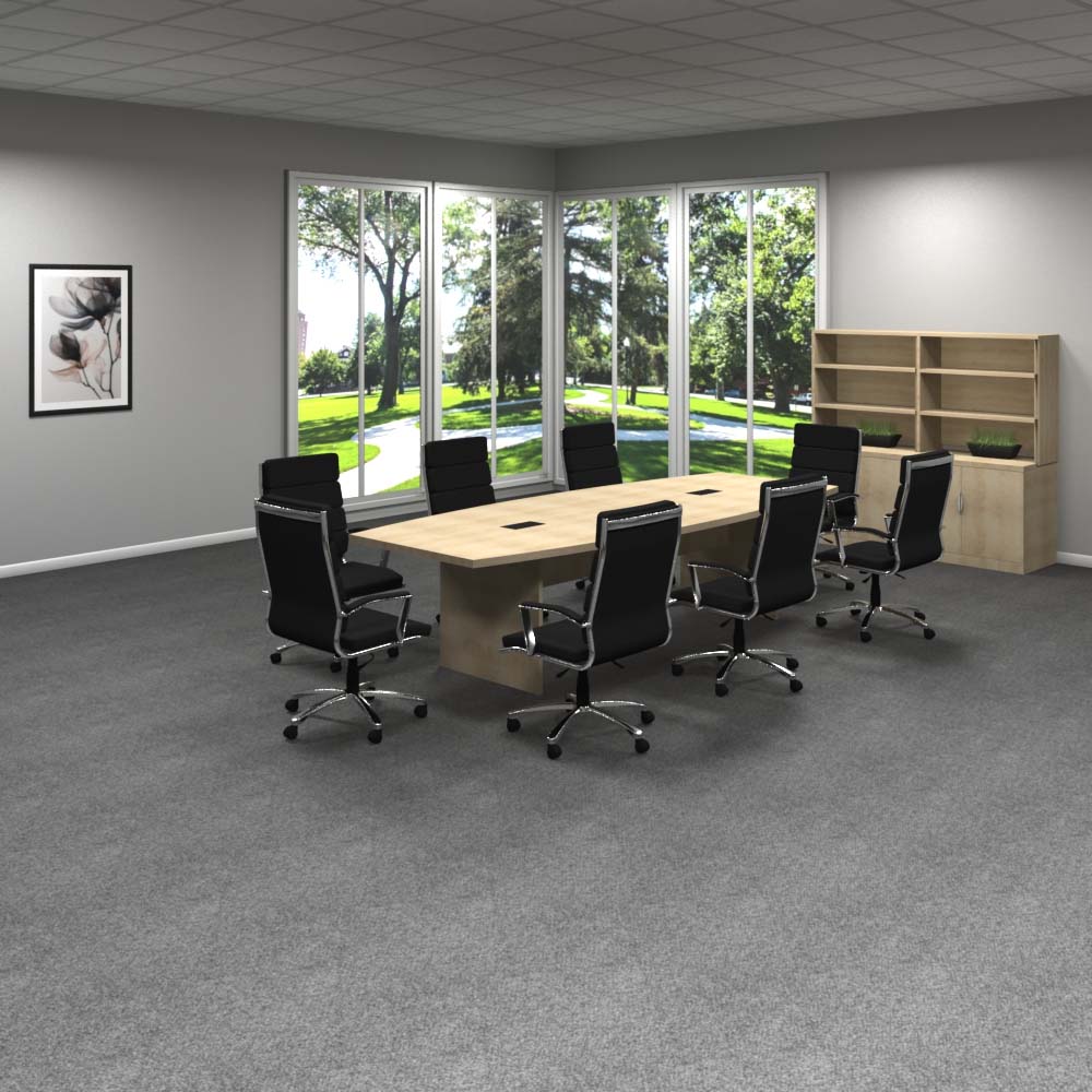 This 4’ x 16’ boat-shaped conference table with a solid slab base offers the perfect combination of elegance and functionality for large boardrooms and executive meeting areas. Designed to comfortably seat up to twelve people, its elongated boat shape enhances communication and visibility, creating an ideal environment for high-level discussions and presentations. The wide surface provides ample space for documents, laptops, and conferencing equipment, while integrated wire management grommets keep cables neatly organized. Constructed from premium, scratch-resistant laminate, this table ensures long-lasting durability and a refined, professional look for any workspace.