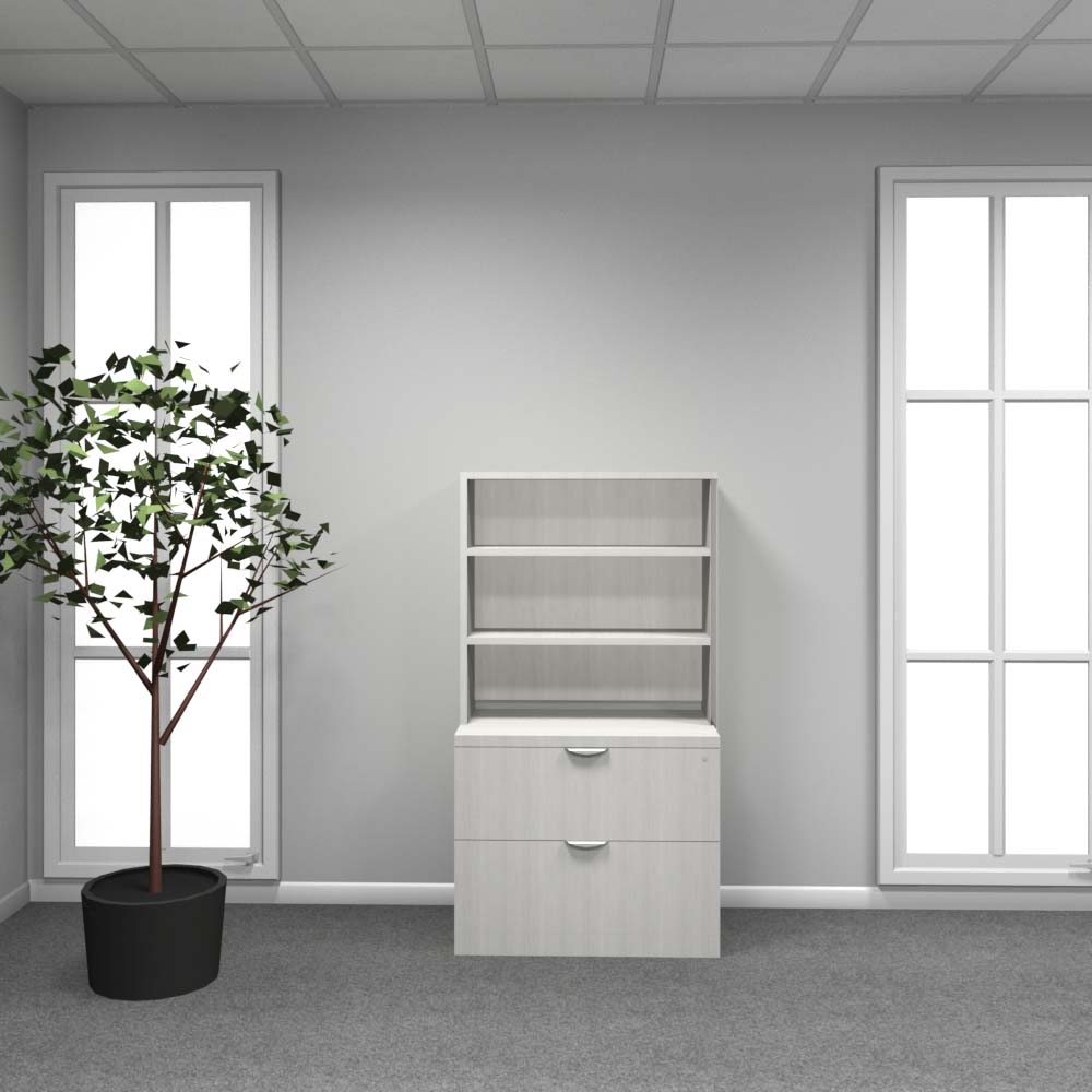 - Storage: Mixed enclosed cabinet and lateral file storage with dual open hutches