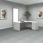- Features: L-shaped design, dual pedestal storage, cable management grommets, full modesty panel