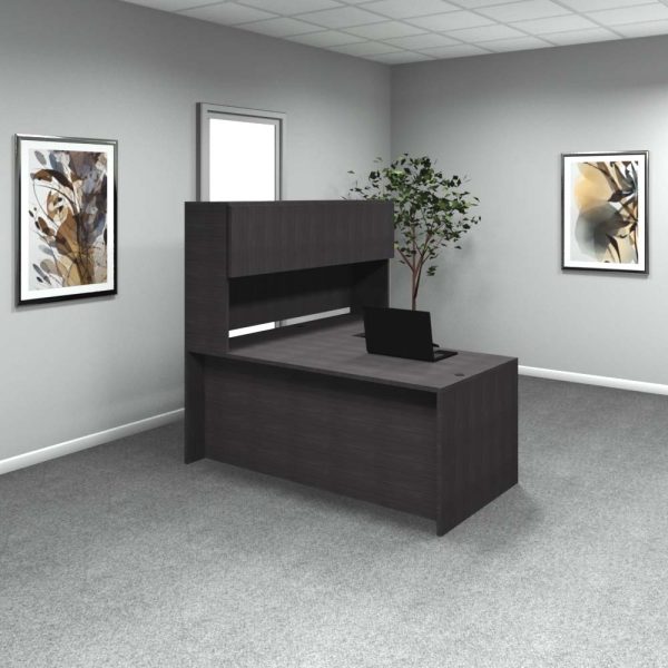 - Features: L-shaped design, overhead hutch, secure pedestal storage, cable management grommets, full modesty panel