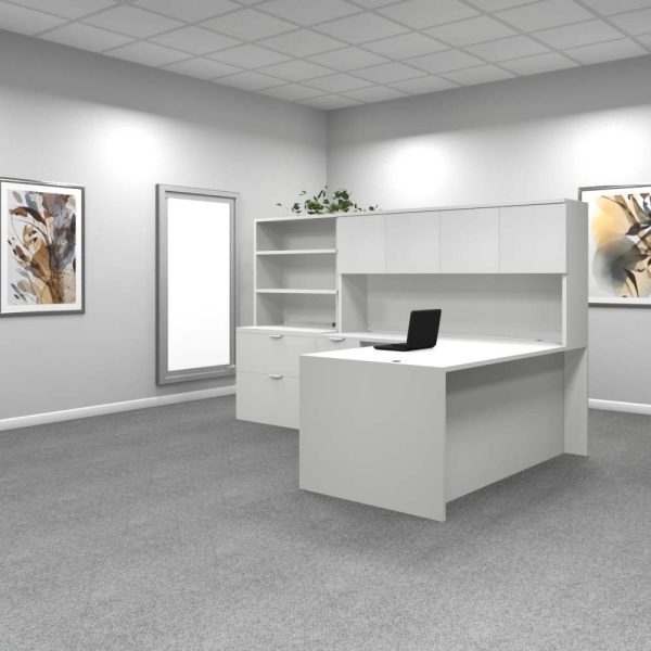 The 72” x 108” Rectangular L Desk in White combines a spacious work surface with extensive storage. Comes with 9 stocked colors and designed for productivity and organization, this desk includes a locking box/box/file pedestal, a 2-drawer lateral file cabinet, and two hutches. The 71” hutch with doors conceals items neatly, while the open hutch above the lateral file provides shelving for books, binders, or display pieces. Cable management grommets keep the desktop clear, and the full modesty panel ensures both stability and privacy. Configurable for left- or right-hand use, this desk adapts easily to any office layout.