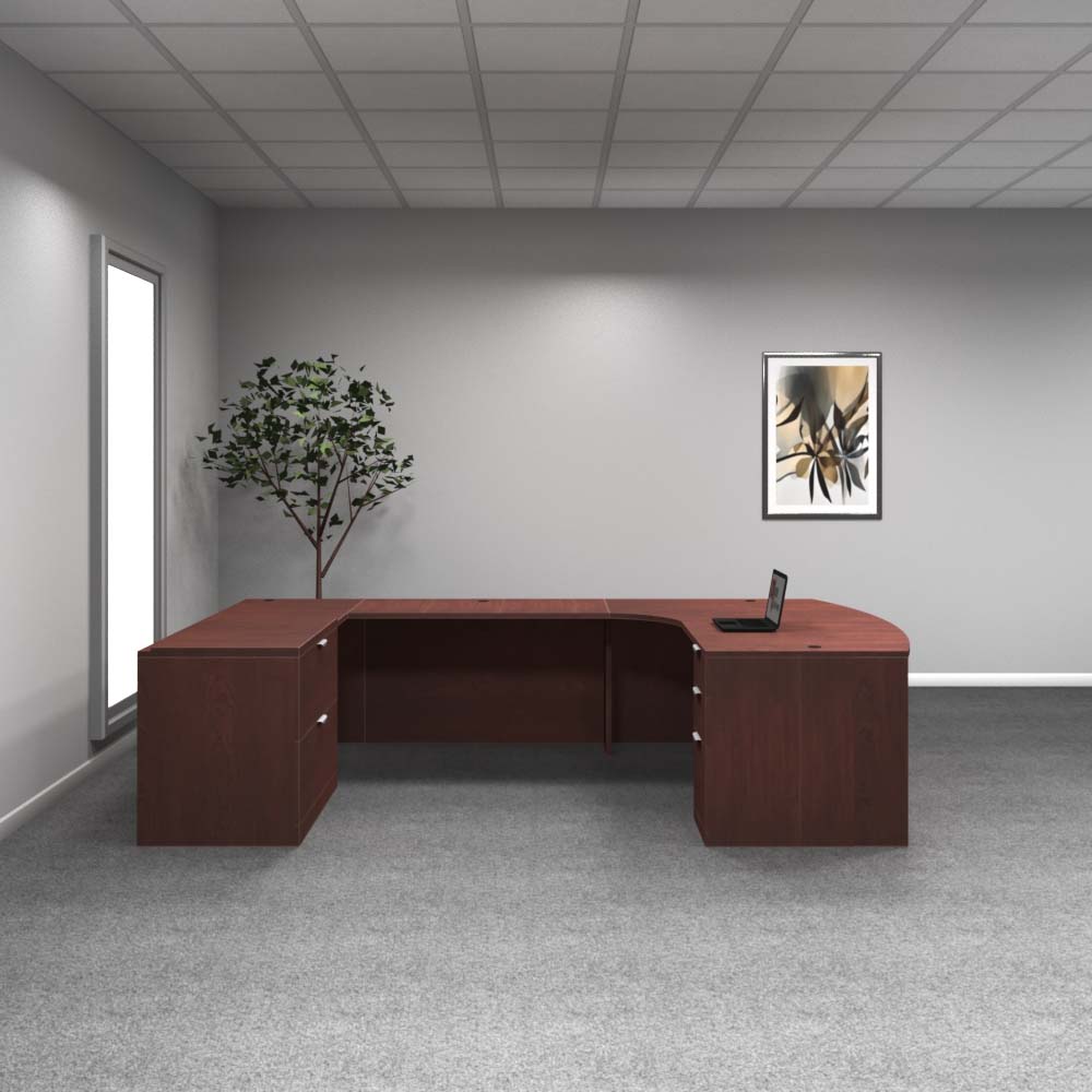 The 72” x 108” x 108” Rectangular U Desk in Cherry offers a commanding workspace designed for executives and professionals who value both style and organization. This U-shaped configuration provides an expansive surface for multitasking and meetings while keeping essential storage within reach. It comes with 9 stocked colors and includes a locking box/box/file pedestal, a 2-drawer lateral file with open hutch, and a 71” hutch with four doors for additional concealed storage. Cable management grommets keep cords tidy, and the full modesty panel provides structure and privacy. Configurable for left- or right-hand use, this desk adapts seamlessly to any office layout.