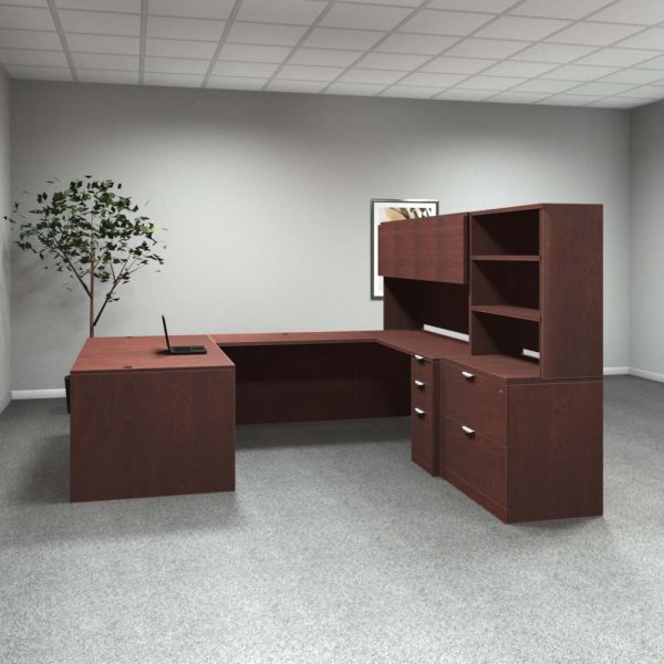 | Features | U-shaped design, multiple hutches for open and concealed storage, secure pedestal drawers, lateral file cabinet, cable management grommets, full modesty panel, durable laminate construction |