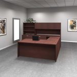 - Features: U-shaped design, secure pedestal storage, lateral file cabinet, 4-door overhead hutch, cable management grommets, full modesty panel, durable laminate construction